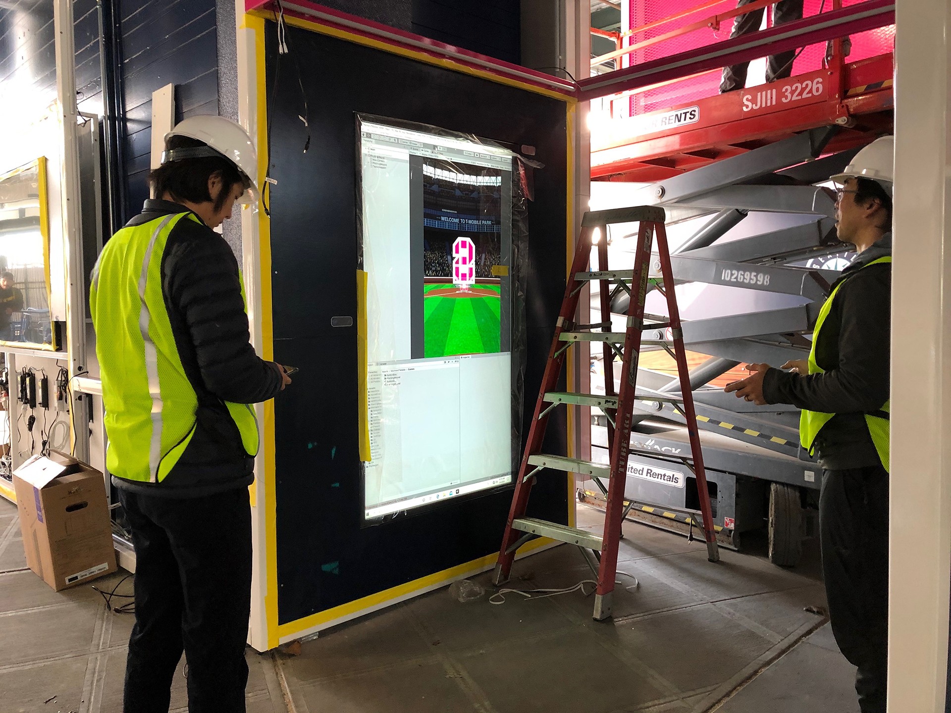 Fans step into a simulated batter’s box to play against a virtual pitcher. When the pitcher on-screen delivers a pitch, the fan will do a swinging motion while three Kinect Sensors capture the fan’s body motions and portray it in the on-screen game.